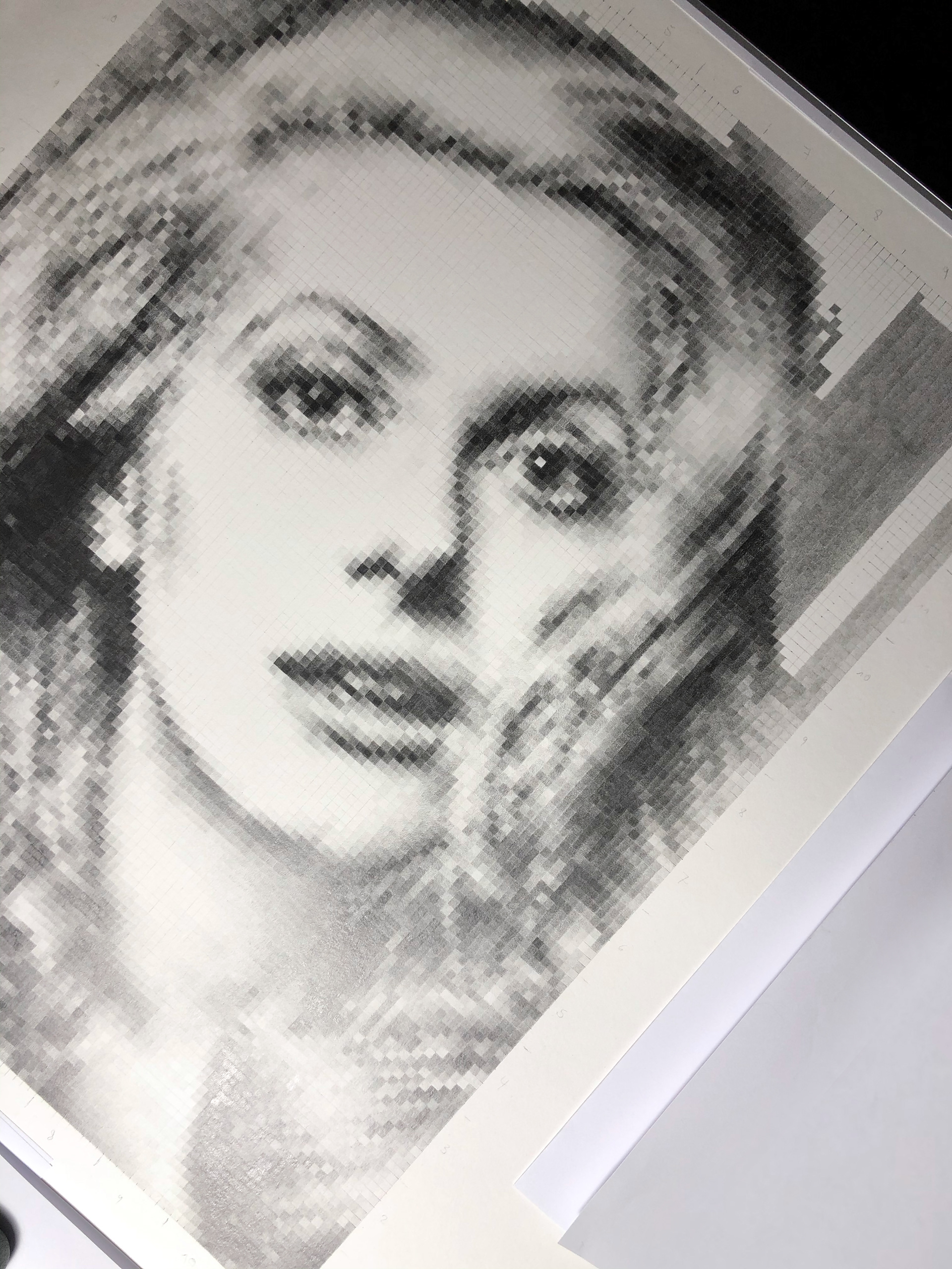 As the digital media has moved into all areas of our life, I had the idea to reverse this concept and visualise a pixelated image with a classic medium on paper with a pencil. The pixelated portrait is formed out of 13.992 filled in squares and displays a well known photo of Catherine Deneuve.